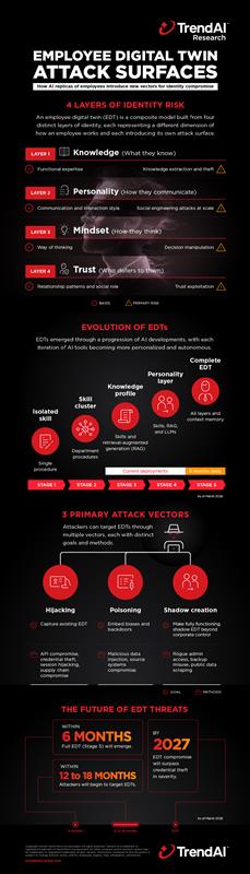 - Employee digital twins (EDTs) create new identity-level attack surfaces. EDTs move risk beyond credentials and systems to the modeled identities of employees, including how they communicate, decide, and exercise authority.